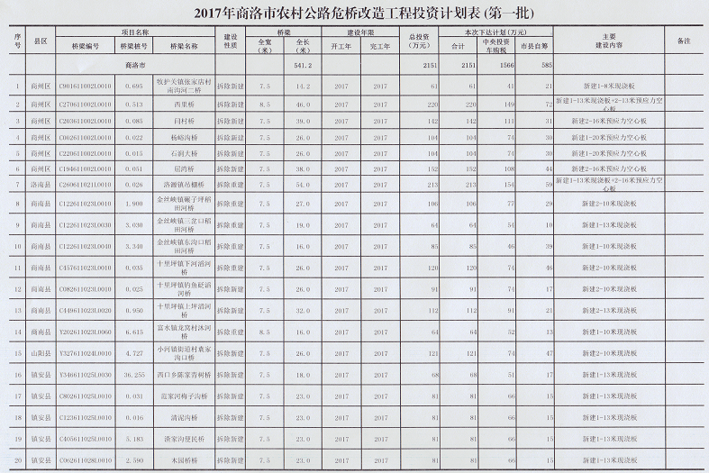 本次计划安排农村公路危桥改造工程投资2151万元,其中中央投资车购税1566万元、市县自筹585万元,改造危桥541.2延米/20座