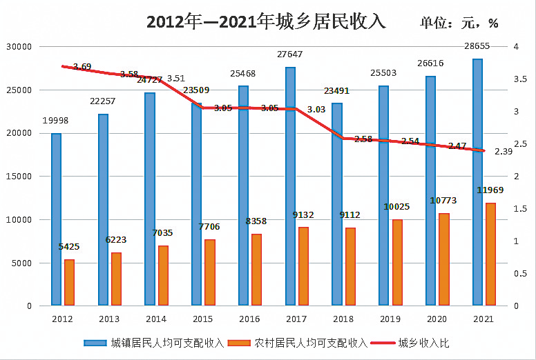 农民生活显着提高。我市坚持把提高农民收入作为实现共同富裕的重中之重,全面落实惠农政策,大力发展特色产业,积极支持创业就业,全方位多渠道力促农民增收致富。2019年,全市农民收入首次突破万元大关;2021年,农村居民人均可支配收入11969元,比2012年增加了6544元,年均增长9.2%,高出城镇居民人均可支配收入年均增速5.1个百分点。城乡居民收入比由2012年的3.69下降为2021年的2.39。