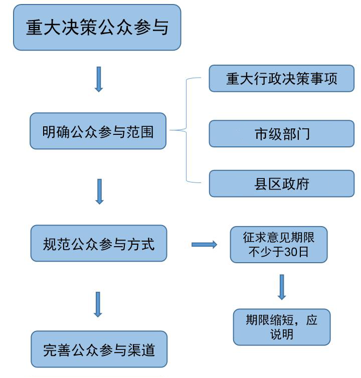第四条 规范公众参与方式。各县区各部门要探索建立民意汇集工作机制,激发公众参与的积极性,确保公众参与规范有序。决策事项向社会公开征求意见的,决策承办单位应当通过政府门户网站、部门网站、政务新媒体以及新闻报刊、广播电视等便于社会公众知晓的途径,公布决策草案及其说明等材料,明确提出意见的方式和期限。公开征求意见的期限一般不少于30日;因情况紧急等原因需要缩短期限的,公开征求意见时应当予以说明。